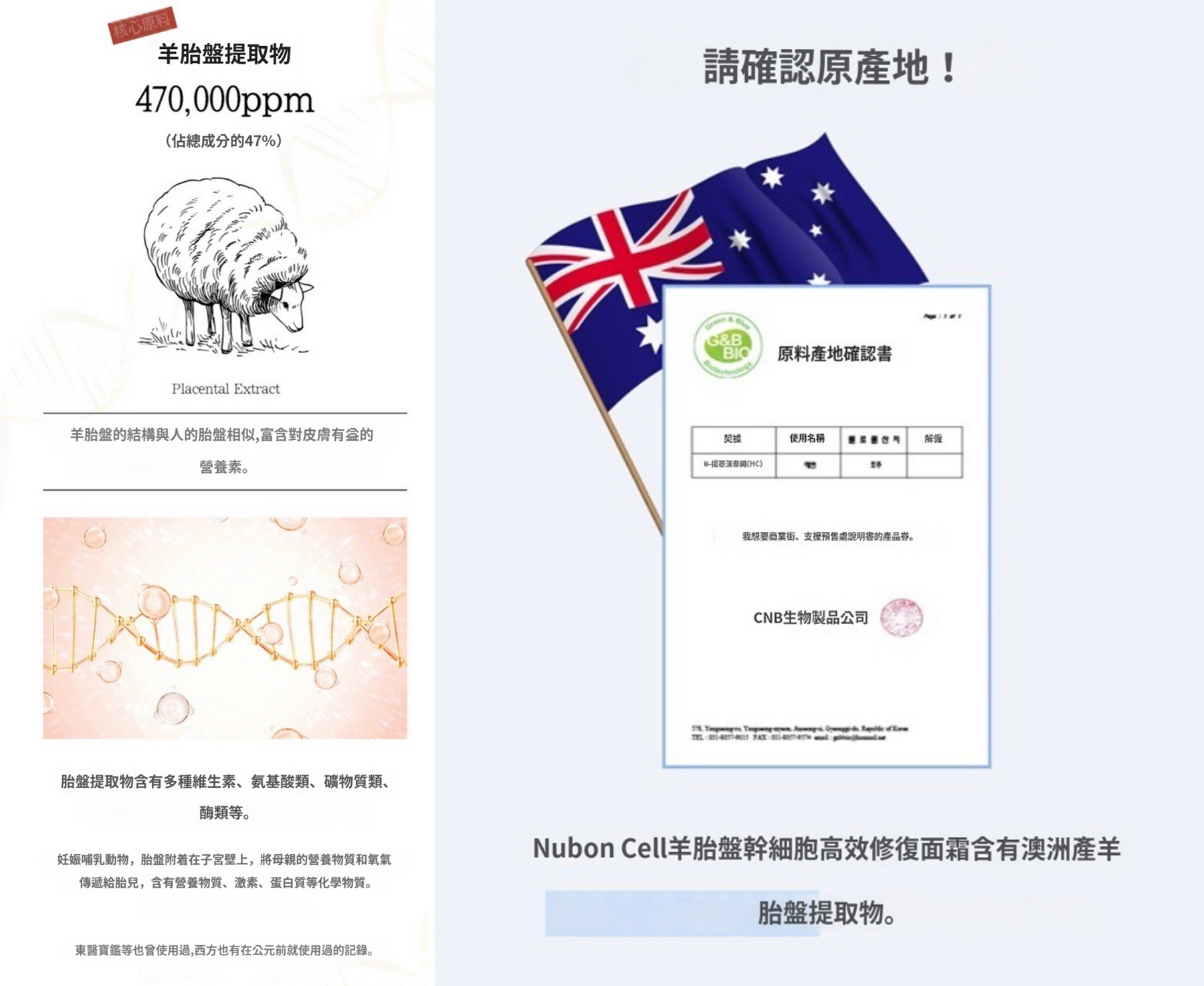♦️澳洲產羊胎盤提取物470,000ppm(佔總成分的47%)——與人的胎盤相似,富含多種維生素、氨基酸類、礦物質類、酶類等對皮膚有益的營養素,幫助改善皮膚彈性,讓沒有彈性的肌膚變得緊緻