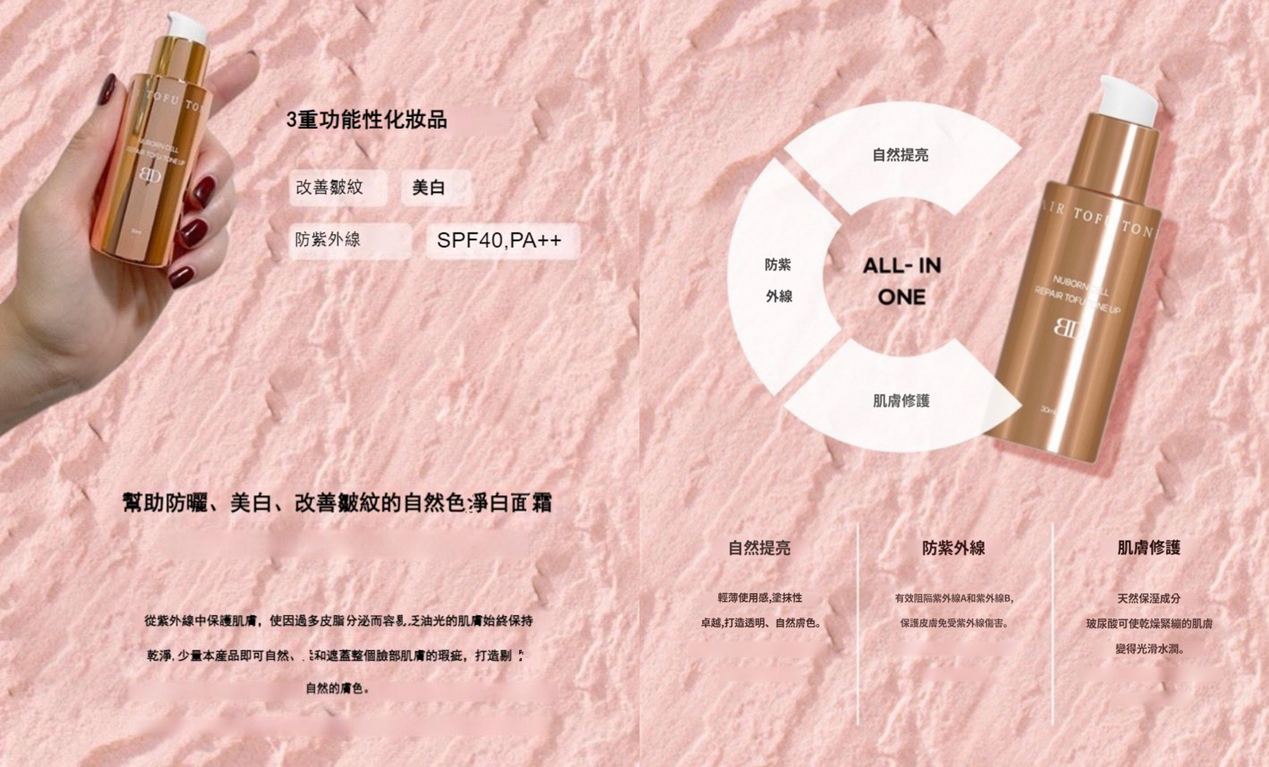 - SPF40,PA++,滿足日常防曬需求;同時隔離UVA和UVB,減緩肌膚衰老速度,預防肌膚曬傷或皮膚癌等;解決上完底妝後,很難補防曬的問題,使用「修護煥採提亮霜」,可以隨時補妝,補防曬;