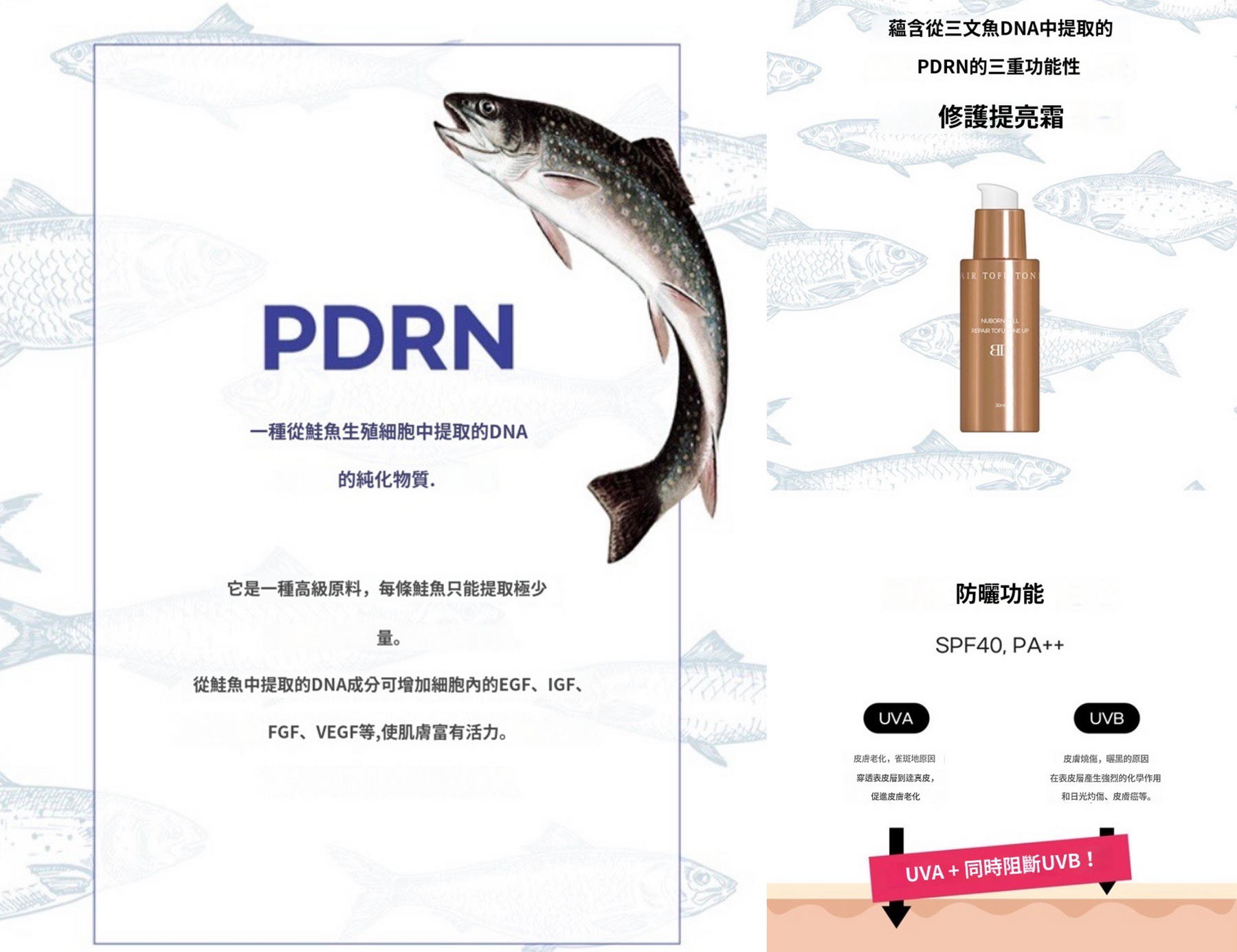 - 從三文魚生殖細胞中提取珍貴的高級原料PDRN——具有可增加細胞內生長因子、IGF、FGF等生長因子活性。一般添加在水光針當中的珍貴成分,加入到粉霜中,可幫助打造完美底妝,讓肌膚光澤透亮,改善肌膚屏障受損,降低炎症等效果,因此是養膚修護精華粉霜;