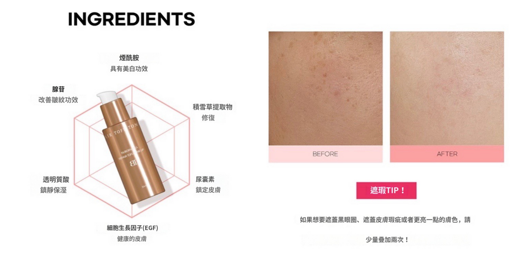 - 積雪草提取物&尿囊素——具有鎮定肌膚作用,打造完美透亮底妝的同時,修護舒緩肌膚,敏敏肌也可安心使用。