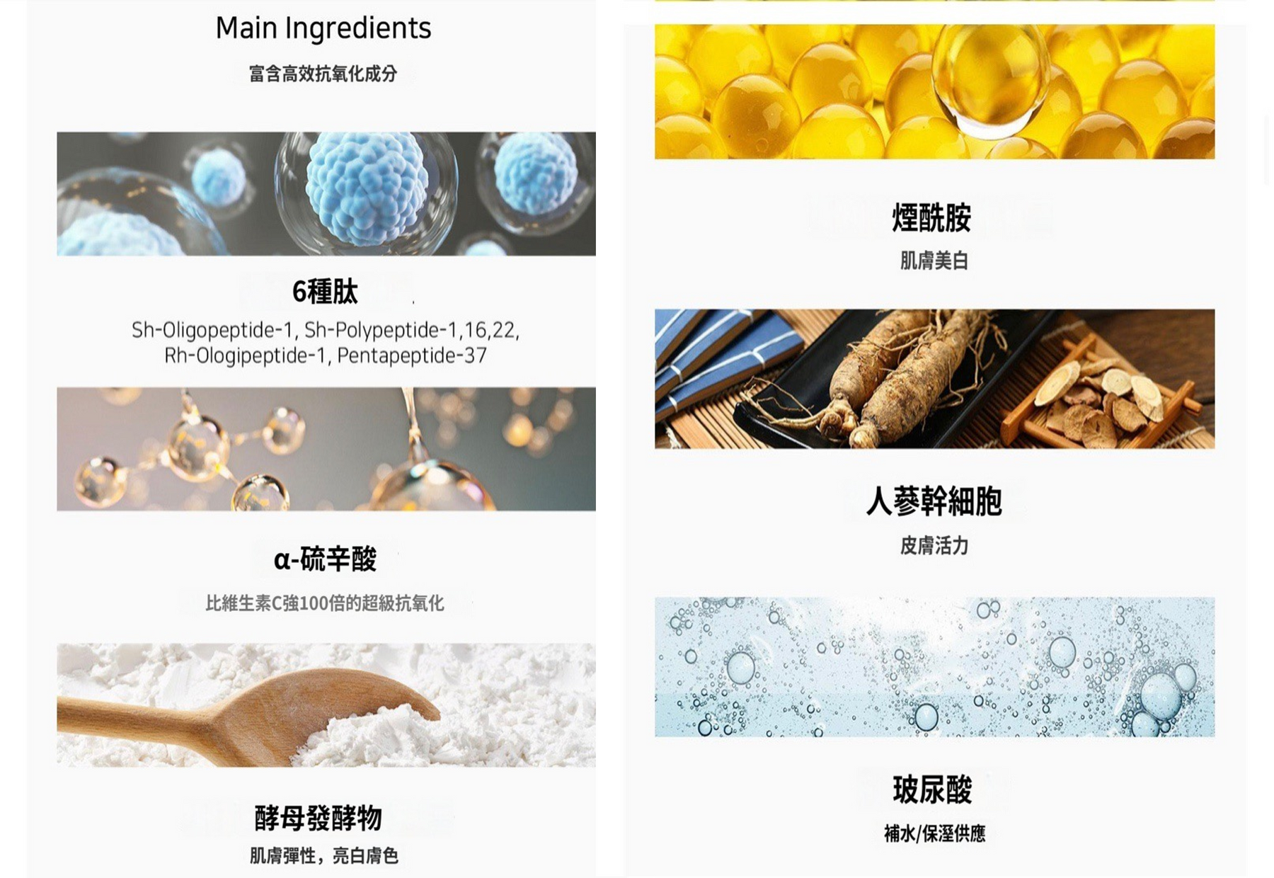 - 酵母發酵物——增加肌膚彈性,亮白膚色