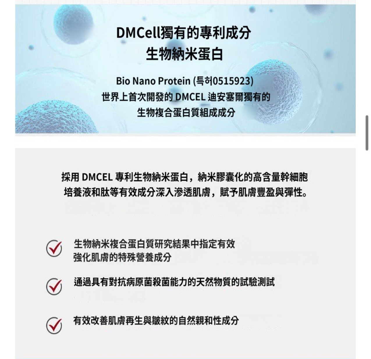 - 採用 DM.CELL專利生物納米蛋白,納米膠囊化的高含量幹細胞培養液和肽等有效成分深入滲透肌膚