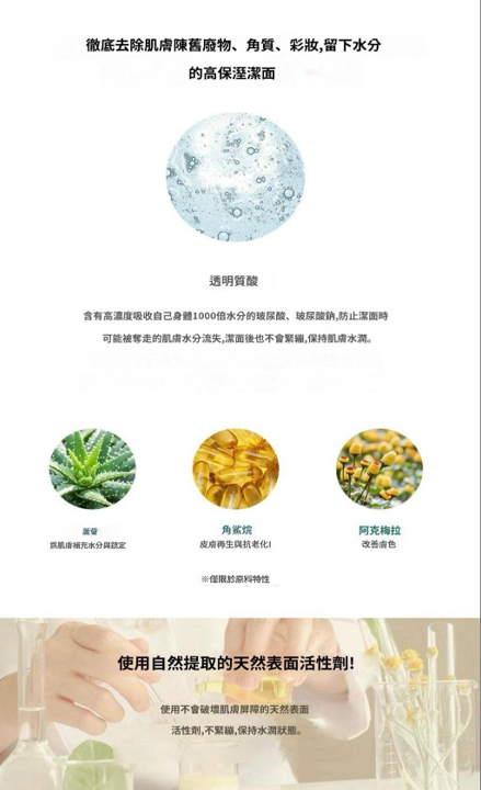 - 透明質酸——含有高濃度吸收自己身體1000倍水分的玻尿酸、玻尿酸鈉,潔面後也不會緊繃,保持肌膚水潤。