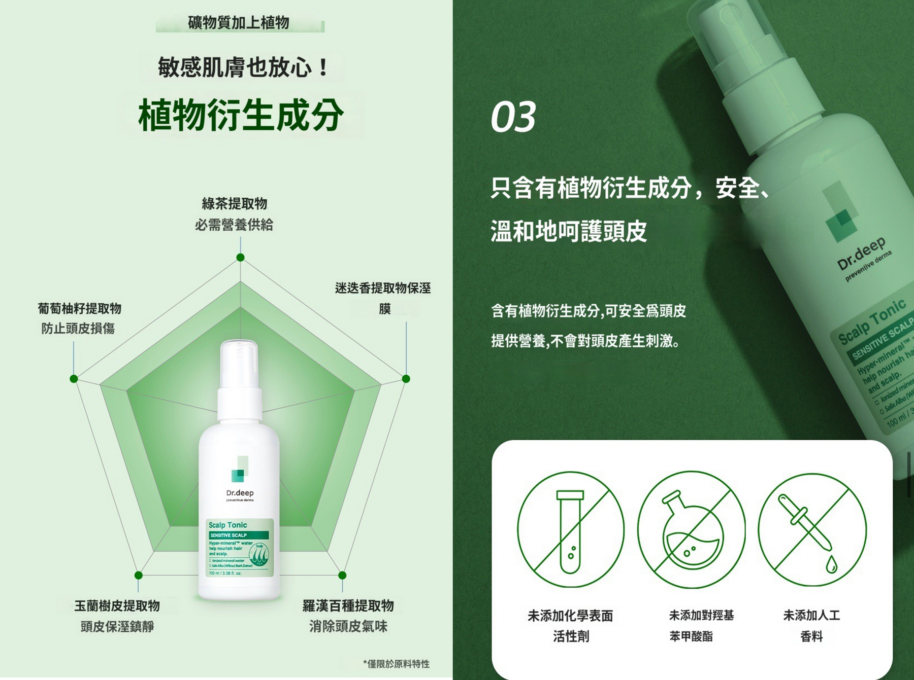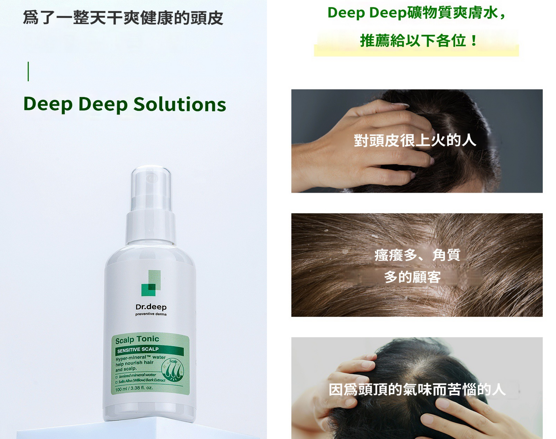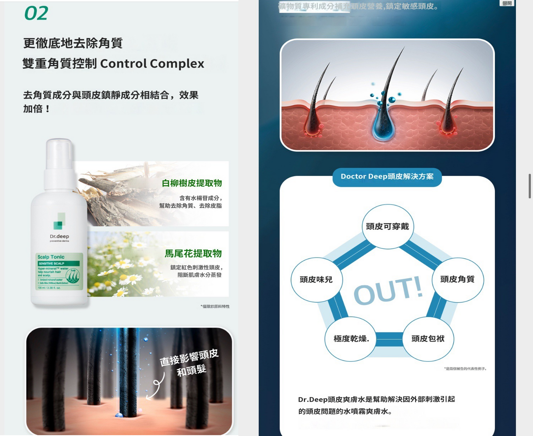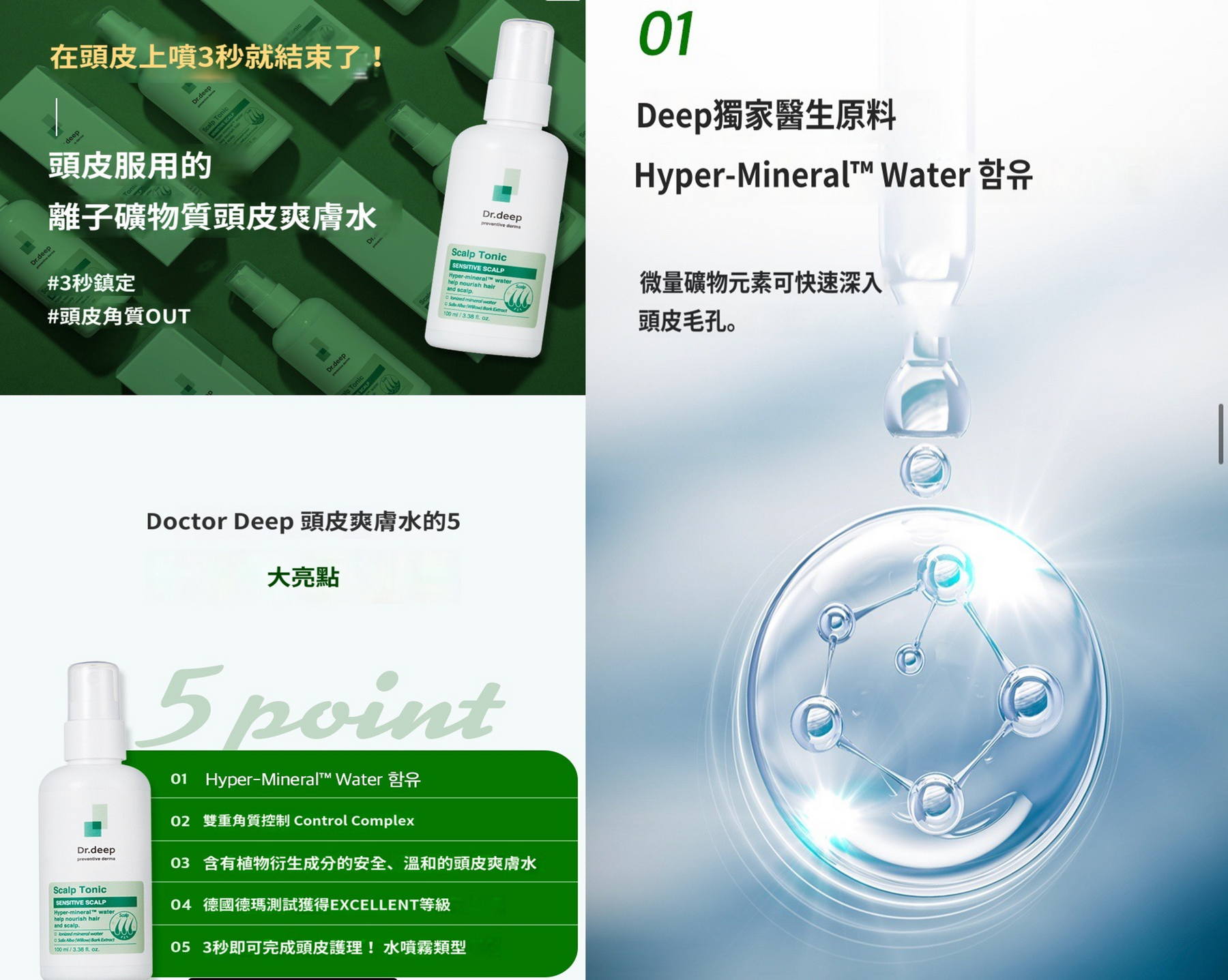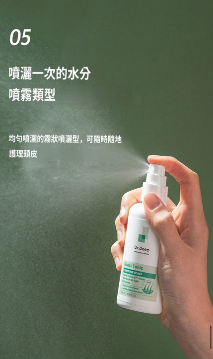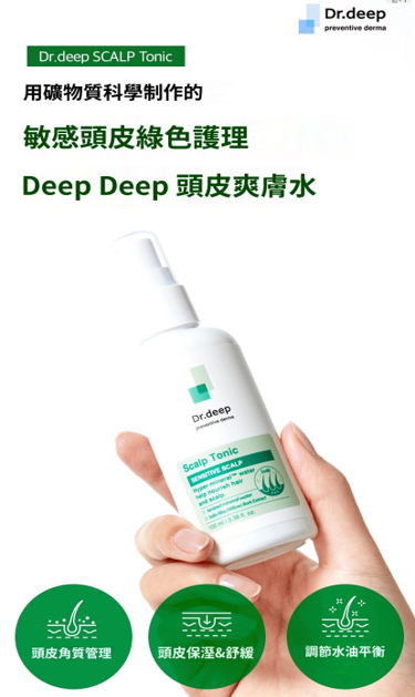 - Deep獨家醫生原料Hyper-Mineral™ Water微量礦物元素可快速深入頭皮毛孔,補充頸皮營養,鎮定敏感頭皮。