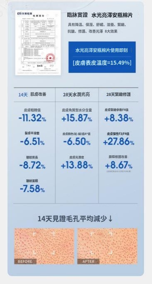 (一盒水光棉片≈1整支藝人還幼水光原液)——蘊含6重多肽,促進膠原蛋白合成,誘導皮膚細胞生成,給肌膚哐哐補充養分,爲皮膚注入活力,水潤光澤肌膚。