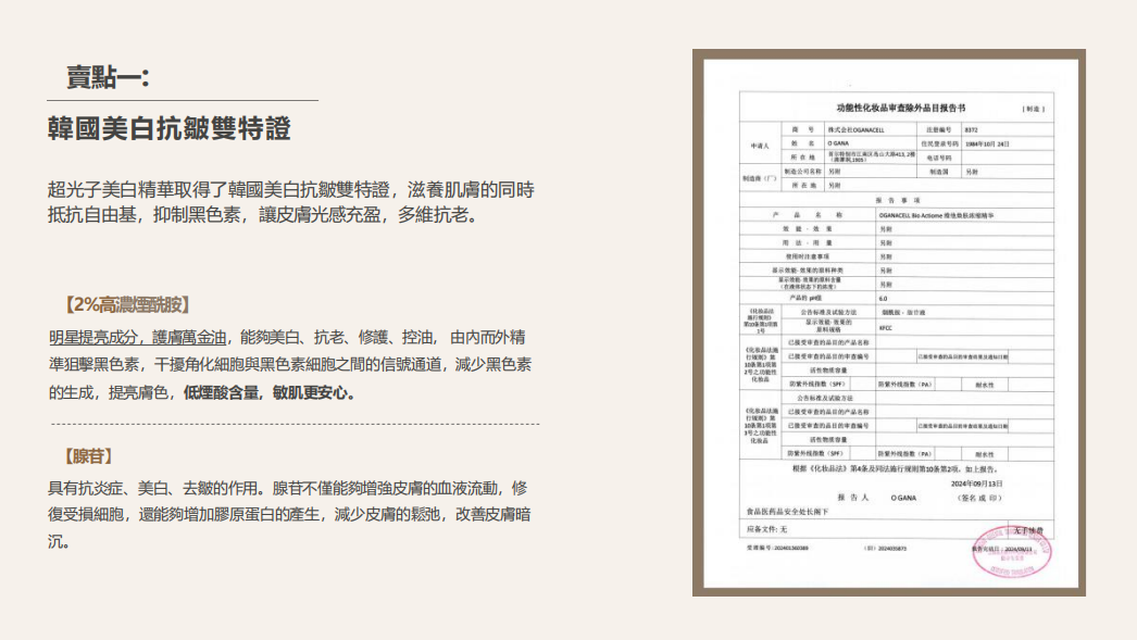 ——分子量小於100kDa,溫和安全,促膠原,護屏障,更水光。 2%高濃煙醯胺&腺苷