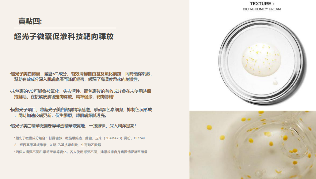 半透精華液質地帶有黃色微囊顆粒一觸即發,感受微囊爆炸的瞬間爲肌膚注入鮮活營養更加飽滿透亮