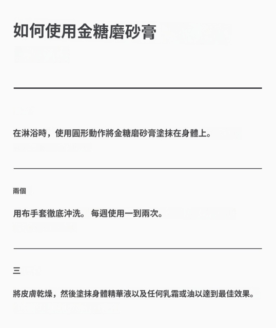 每周1 - 2次,洗澡時挖一勺金糖磨砂膏,在頸部到腳部打圈按摩💆♀️ 細膩的砂糖顆粒配合絲滑質地,不會刺痛肌膚,反而像給身體做 SPA~