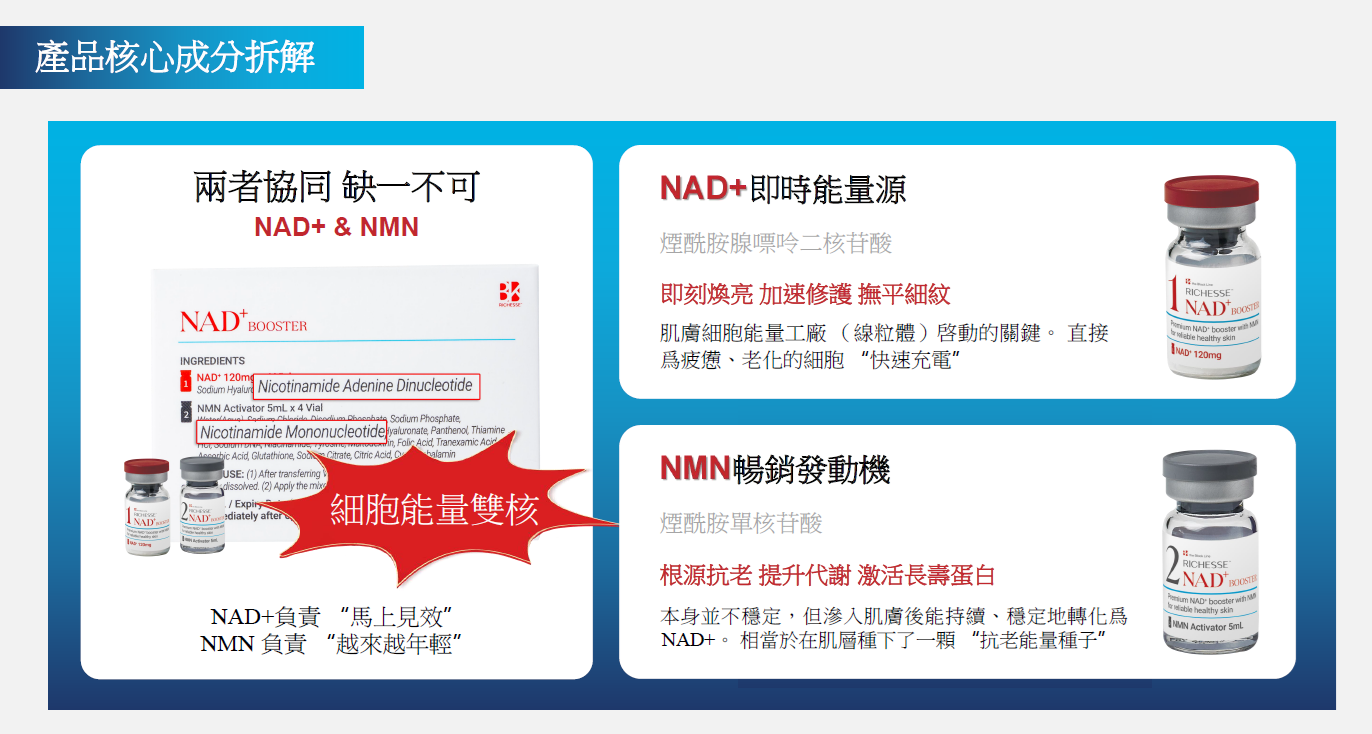 核心成分NAD+與NMN科學配伍。NAD+即時提升皮膚能量,快速改善暗沉; NMN作爲前體持續轉化爲NAD+,從根源增強細胞代謝,實現“即時煥活+長期抗老”。