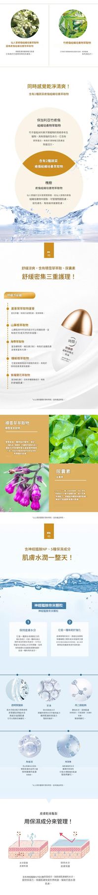 - 含有舒緩的冷卻器 ——是一種專利成分,有助於減少皮膚熱量,由五種天然提取 物組成蘆薈、海帶、山藥根、榆樹根和紫羅蘭,增強皮膚的自 然力量,有助於鎮靜皮膚。