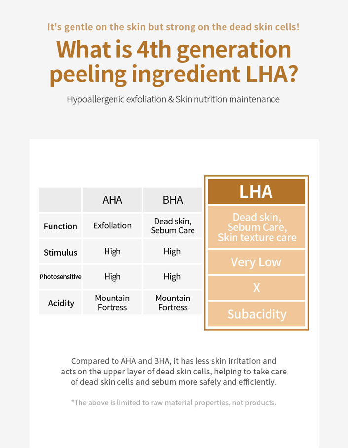 - 含有新一代去角質成分LHA——與以往刺激性強的去角質成分不同,成分更溫和,可溫和調理陳舊廢物與角質,幫助打造細滑、柔嫩的肌膚紋理。