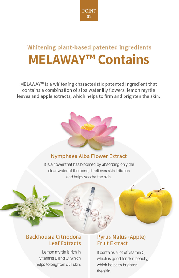 - 含有美白植物性專利成分MELAWAYT™️——含有阿爾巴睡蓮花、檸檬草葉、蘋果提取物,幫助打造緊緻、光彩照人的肌膚。