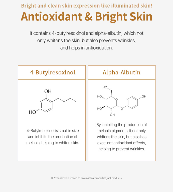 - 含有4-丁基間苯二酚&a-熊果苷——不僅美白肌膚,還防止皺紋,有助於抗氧化。