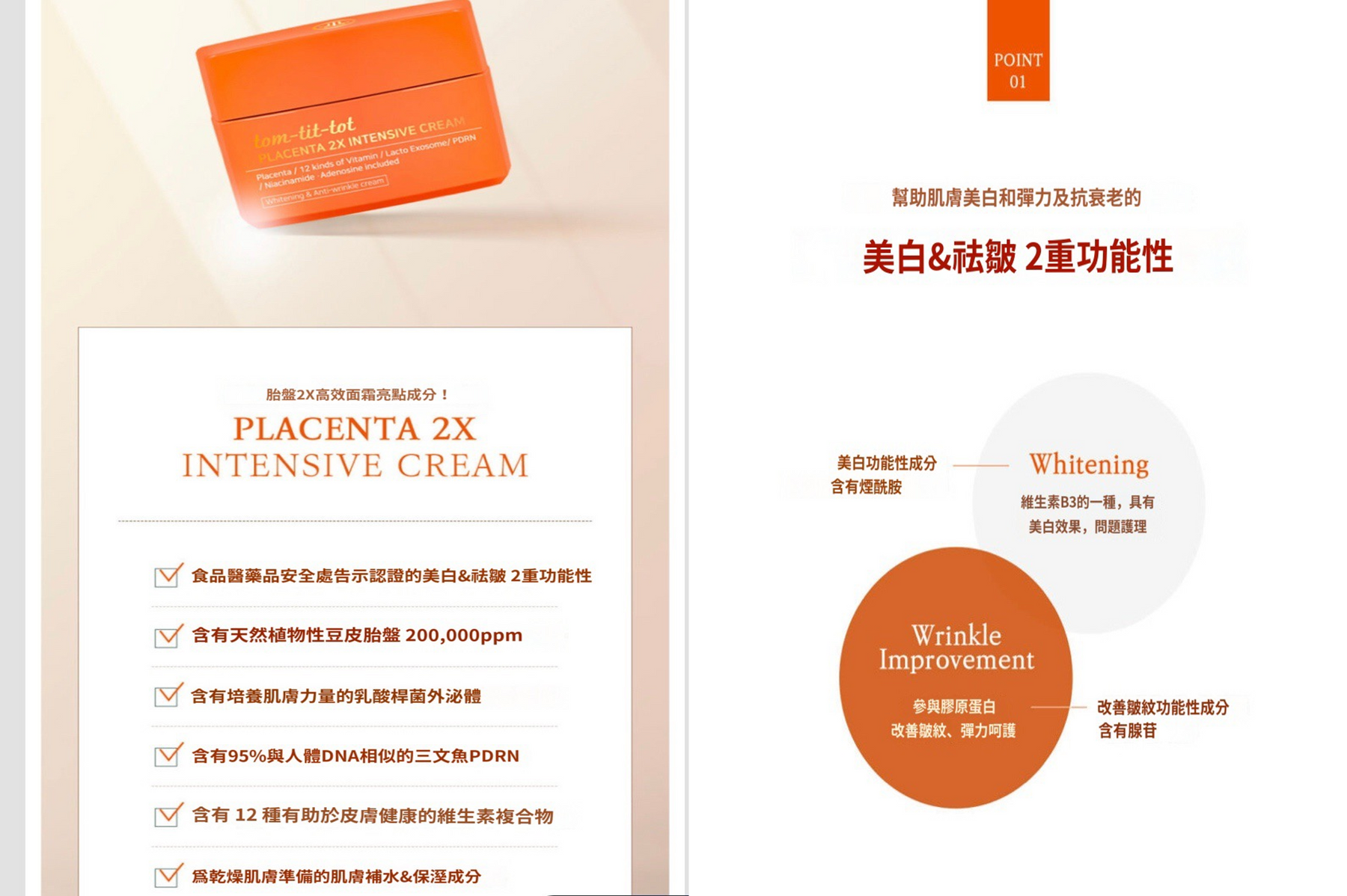- 含有食藥處公告認證成分煙酰胺和腺苷——有助於美白肌膚、改善皺紋,增強肌膚彈力